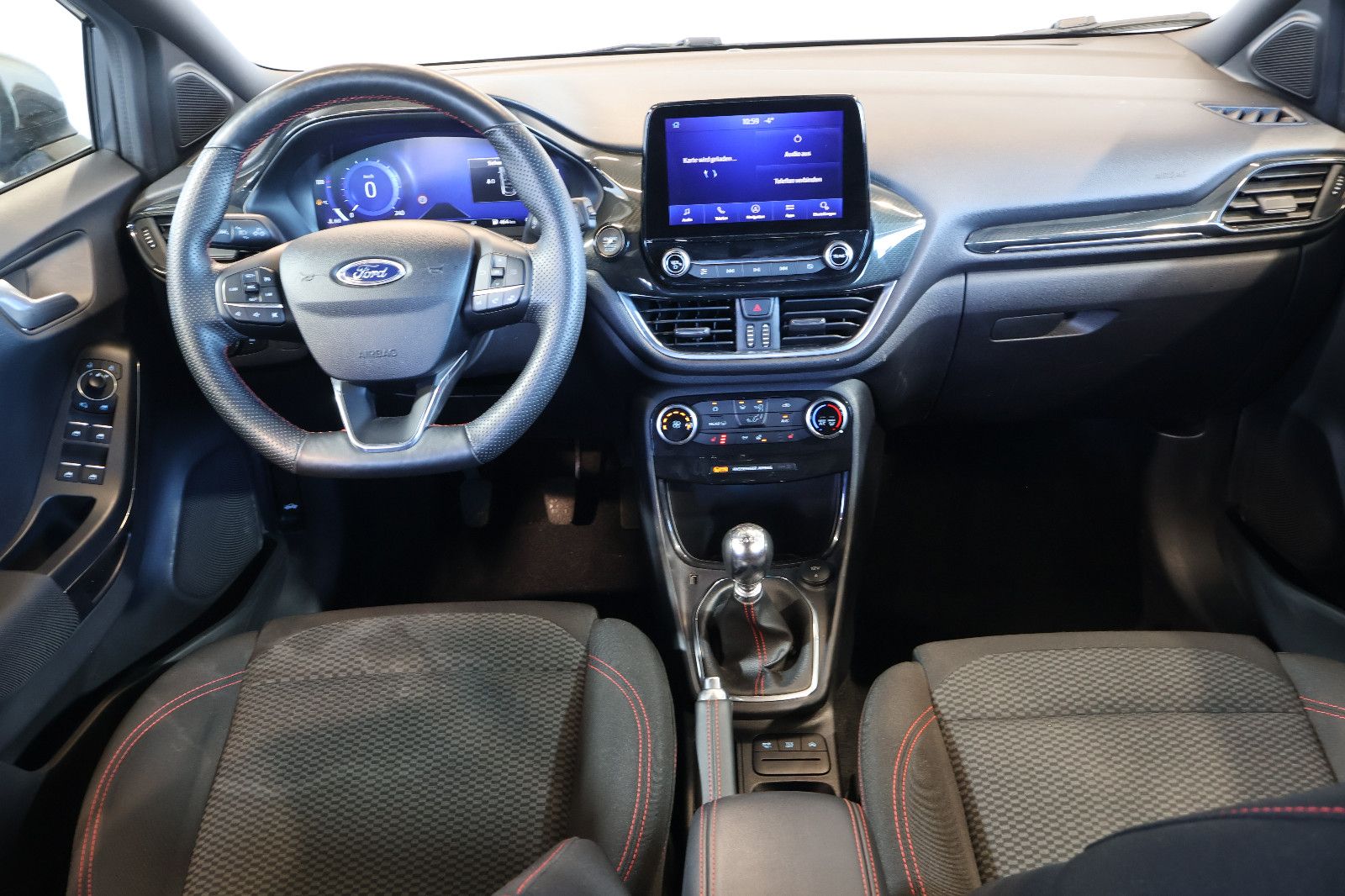 Antischlupfregelung (ASR), Audio-Navigationssystem Ford mit AppLink, Außenspiegel elektr. anklappbar, Außenspiegel elektr. verstell- und heizbar, Body-Styling-Paket, Dachhimmel Stoff, dunkel, Eco-Anzeige für verbrauchsoptimiertes Fahren (EcoCoach), Einparkhilfe hinten, Fahrassistenz-System: Berganfahr-Assistent (Hill-Holder), Fahrassistenz-System: Falschfahrer-Warnfunktion, Fahrassistenz-System: Fernlichtassistent (Scheinwerfer mit Abblendautomatik), Fahrassistenz-System: Notbrems-Assistent, Fahrassistenz-System: Post-Collision-System, Fahrassistenz-System: Pre-Collision-System, Fahrassistenz-System: Spurhalteassistent mit Müdigkeitserkennungs-Sensor, Fahrassistenz-System: Verkehrsschildassistent, Farbdisplay für Bordcomputer, Fensterheber elektrisch vorn + hinten mit Komfortschließung, FordPass Connect inkl. eCall, Fußmatten Teppich, Getriebe 6-Gang - Typ: 6MX65, Heckleuchten LED, Innenraumfilter: Staub- und Pollenfilter, Intelligent Protection System (IPS), Intelligenter Geschwindigkeits-Begrenzer, Isofix-Aufnahmen für Kindersitz, Karosserie: 5-türig, Kombiinstrument Digitalanzeige 12,3 Zoll, Kopfstützen hinten mechan. verstellbar (3 Stück), Laderaumboden variabel (Ford Megabox), Lendenwirbelstütze Sitz vorn links, Lenksäule (Lenkrad) höhen-/längsverstellbar, LM-Felgen, Mild-Hybrid 92 kW (Motor 1,0 Ltr. - 92 kW EcoBoost), My Key (2. Fahrzeugschlüssel programmierbar), Nebelscheinwerfer LED, Otto-Partikelfilter (OPF), Pedale Aluminium, Radstand 2588 mm, Reifen-Reparaturkit, Reifendruck-Kontrollsystem, Rücksitzlehne geteilt/klappbar (60:40), Schadstoffarm nach Abgasnorm Euro 6d, Scheinwerfer LED, Scheinwerfer-Assistent mit Tag-/Nachtsensor, Sitze vorn höhenverstellbar, Sonnenblende links mit Spiegel (beleuchtet), Sonnenblende rechts mit Spiegel (beleuchtet), Sport-Fahrwerk, Sportsitze vorn, Standard Variante, Start/Stop-Anlage, Türgriffe außen Wagenfarbe